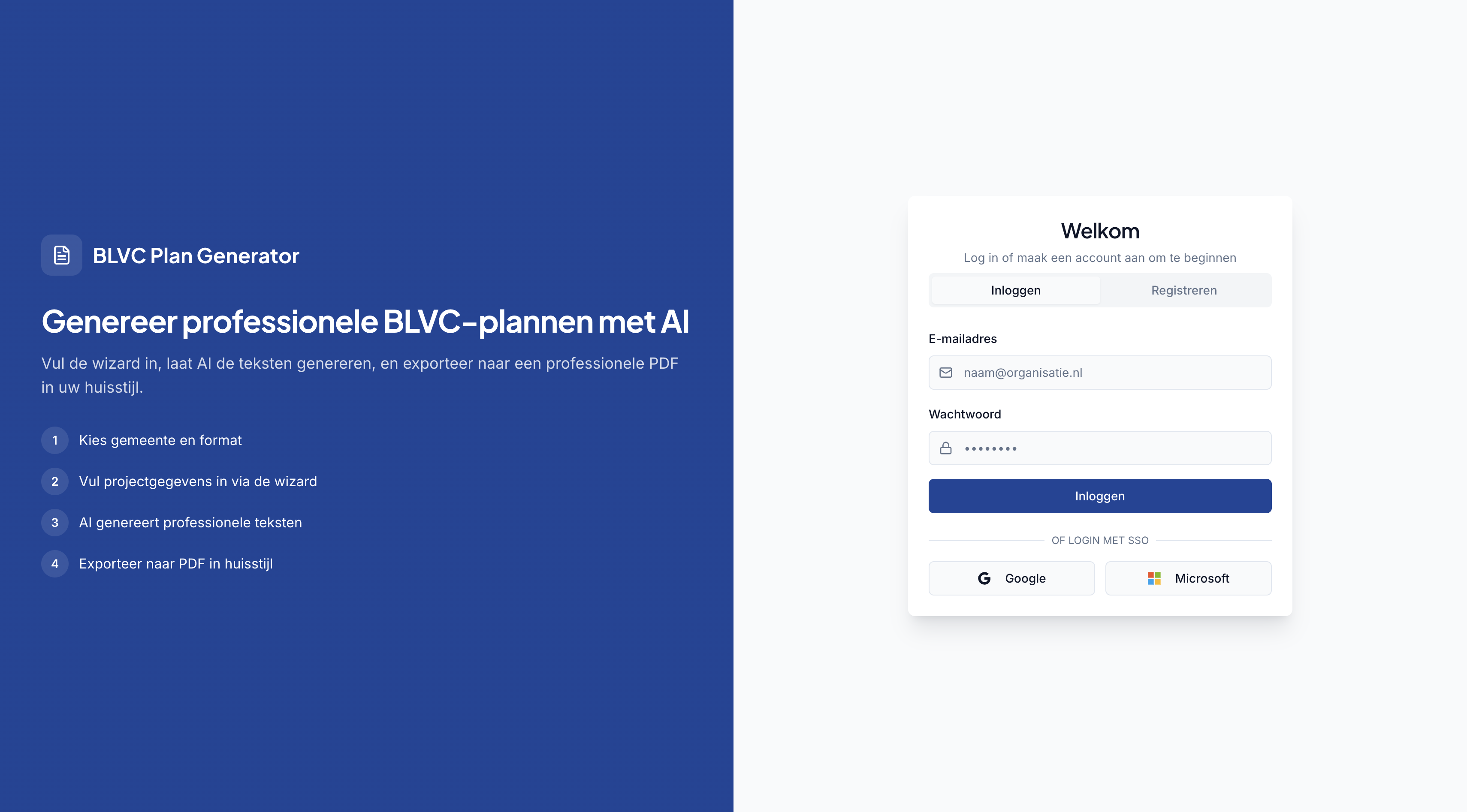 Binnen twee minuten kun je aan de slag met de Untied BLVC Generator. Je logt veilig in met je e-mailadres of via SSO (Google of Microsoft) en komt direct in jouw eigen werkomgeving. Daar beheer je projecten, werk je samen met collega’s en genereer je per project een projectspecifiek BLVC plan zonder gedoe met losse bestanden of versies.